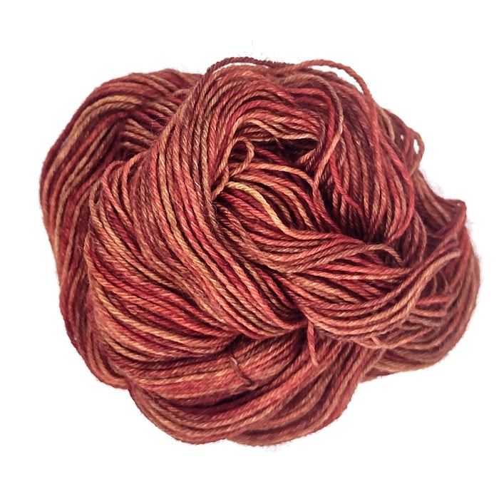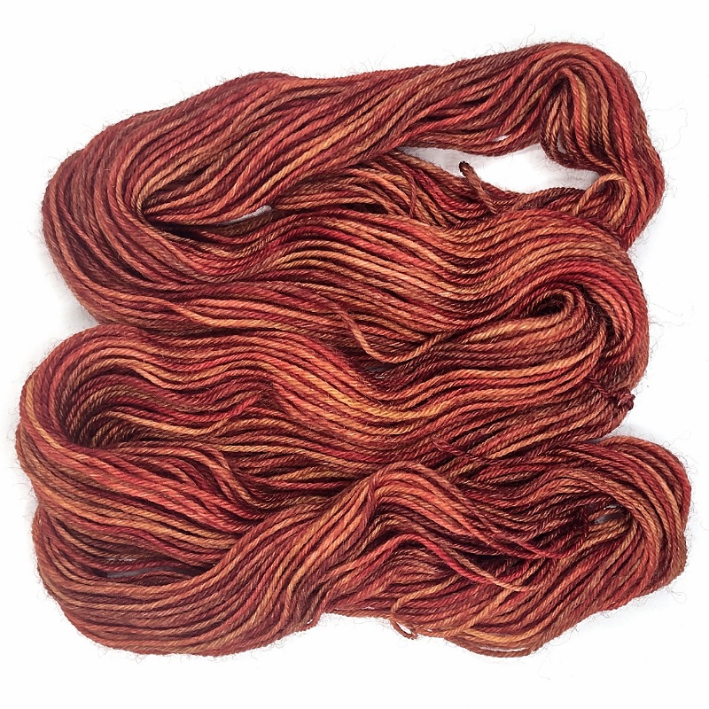 Hand Dyed Yarn Mini – 4 Ply  75/25 Superwash Merino/Nylon 20g. Tonal shades of red, orange, brown, gold and ochre. Perfect for making socks, hat, mitts or a pretty cowl, shawl or blanket.
