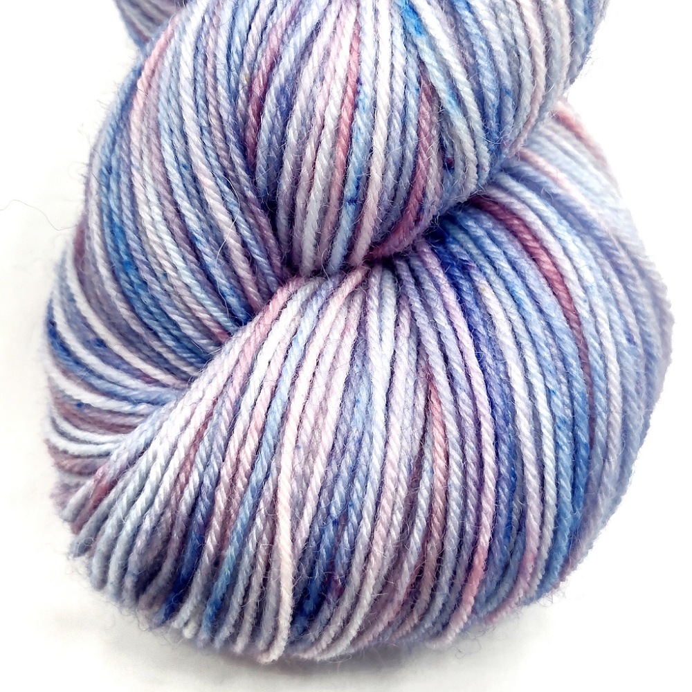 Hand Dyed Yarn 4 Ply Superwash 75/25 Merino/Nylon 100g 400m approx. Tonal soft blue, lilac and pink shades with pink and blue speckles.