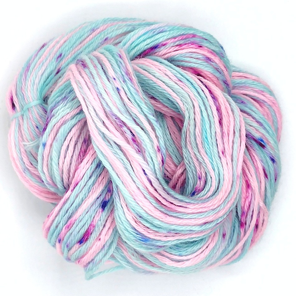Hand Dyed Yarn Mini 75/25 Superwash Merino/Nylon 20g. Aqua blue, pink, lilac shades with pink, blue and plum speckles. Perfect for making socks, hat, mitts or a pretty cowl, shawl or blanket.