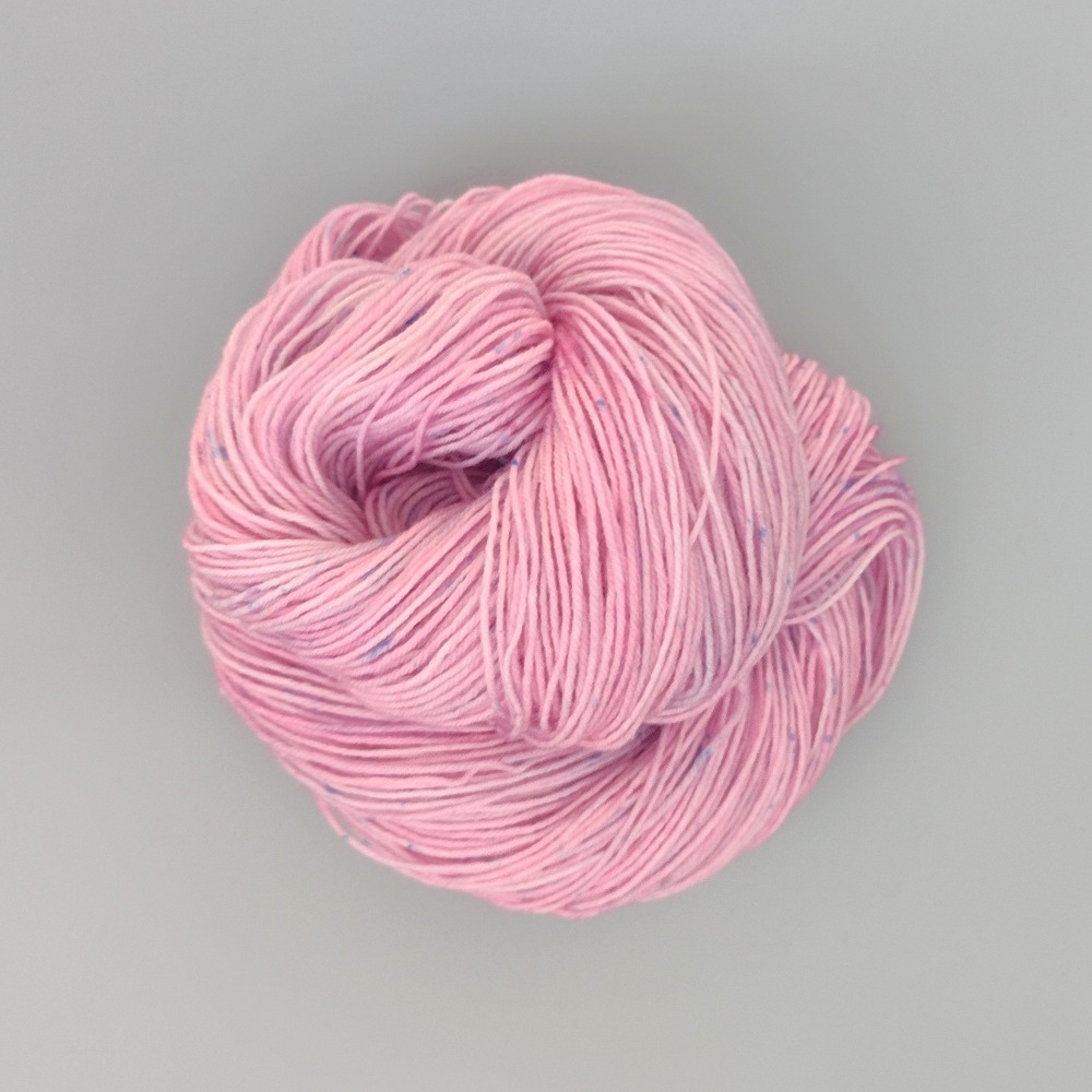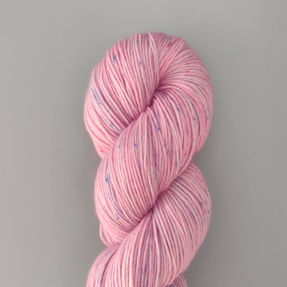 Hand Dyed Yarn 4Ply 75/25 Superwash Merino/Nylon 100g 400m approx. Pretty pink/soft lilac shades with pink, blue speckles. Perfect for making socks, hat, mitts or a pretty cowl, shawl or blanket.