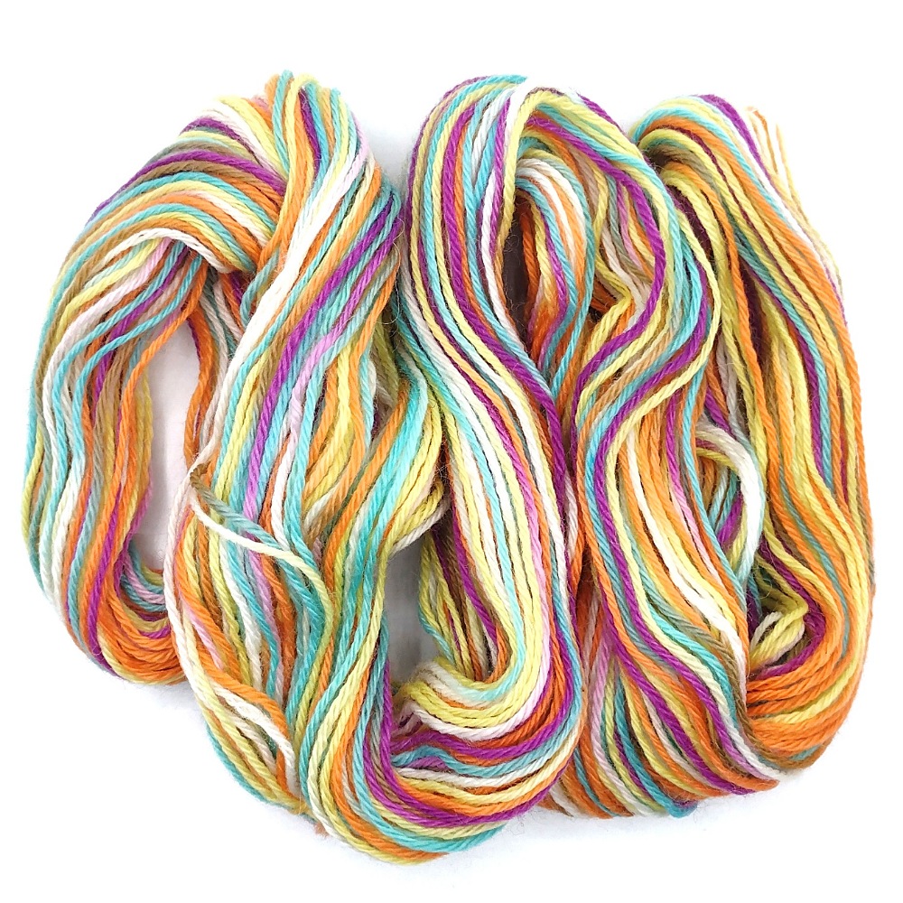 Hand Dyed Yarn Mini 4 Ply Superwash 75/25 Merino/Pastel 25g. Tonal shades of orange, yellow, teal, plum and white. Perfect for making socks, hat, mitts or a pretty cowl, shawl or blanket.